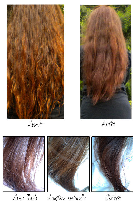 Après le henné, j'adorais la couleur!! Ça donnait un châtain foncé avec des reflets grenat et parfois prune.